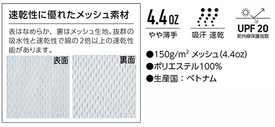 吸汗速乾に優れたドライ生地を採用しているので、汗をかいてもサラッとした着用感が快適です。