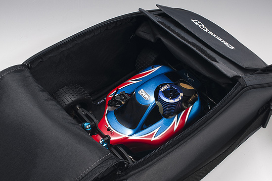 | バッグ左下にはパワーズオフィシャルロゴの刺繍が施されています。 | 1/16〜1/18スケールのタムテックギアなどのミニスケールRCの持ち運びにも便利です。内側はビニール地なので汚れもふき取りやすいです。 | パーツケースや予備バッテリー等を収納できる小物入がバック上部に設けられています。 |